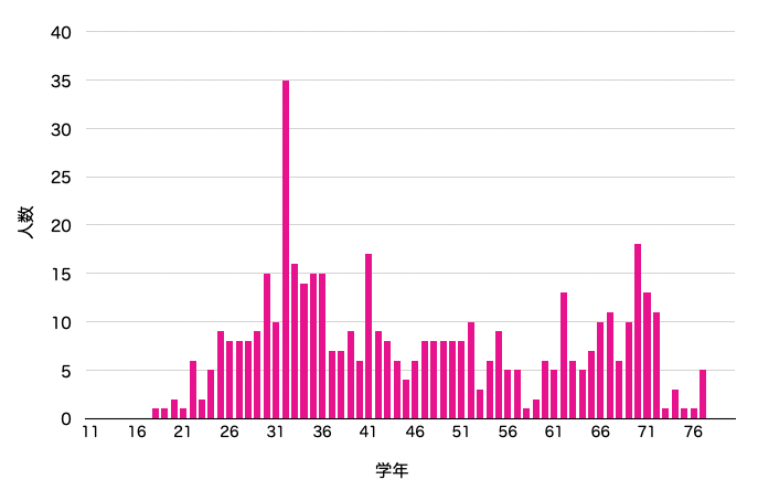 学年別情報 2025.06.122026.04.14 高11高12高13高14高15高16 (1)高17高18 (1)高19 (1)高20 (2)高21 (2)高22 (6)高23 (3)高24 (5)高25 (9)高26 (8)高27 (9)高28 (8)高29 (9)高30 (17)高31 (10)高32 (35)高33 (16)高34 (14)高35 (16)高36 (15)高37 (8)高38 (7)高39 (9)高40 (6)高41 (17)高42 (9)高43 (8)高44 (6)高45 (4)高46 (6)高47 (8)高48 (9)高49 (8)高50 (9)高51 (8)高52 (10)高53 (3)高54 (6)高55 (10)高56 (5)高57 (6)高58 (1)高59 (2)高60 (8)高61 (5)高62 (13)高63 (7)高64 (5)高65 (7)高66 (12)高67 (12)高68 (6)高69 (10)高70 (18)高71 (13)高72 (11)高73 (1)高74 (5)高75 (1)高76 (1)高77 (6)高78高79高80 ☆ 学年別人数ランキング ☆ ランキング学年人数1高32352高70183高41174高33165高30155高35155高3615 ★ 各学年人数比較 ★